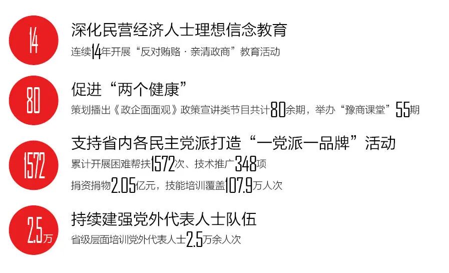 近年來,河南重點開展了“招商引資拼經濟·統一戰線在行動”活動,舉辦“同心出彩·港澳臺海外代表人士和海內外知名豫商中原行”、豫港經貿交流推介會、全國優強民營企業助推河南高質量發展大會、豫臺經貿洽談會等一系列活動,積極牽線搭橋,為河南招商引資、人才引進等匯聚力量和動能。